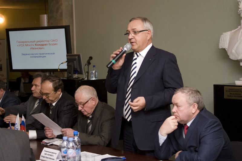 Открывая конференцию, генеральный директор УСК «МОСТ» Б.И.Кондрат отметил, что ее целью является возрождение существовавших издавна традиций – развитие научной составляющей процесса строительства внеклассных сооружений. Строящийся мост лежит на грани технических возможностей современной инженерии, и наша задача – возродить диалог специалистов, ученых и практиков с целью ликвидации существующих сегодня разрывов в нормативной базе, в процессе проектирования и сооружения мостовых объектов.